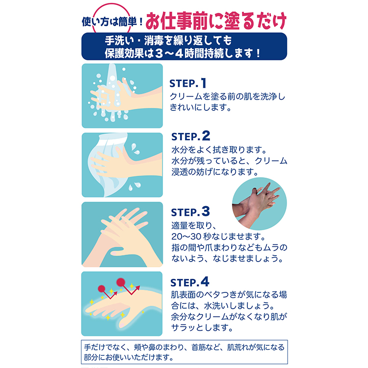 ○保湿効果は約3~4時間持続します。頻繁に手洗いや消毒を行わなければならない場合にも安心です。
