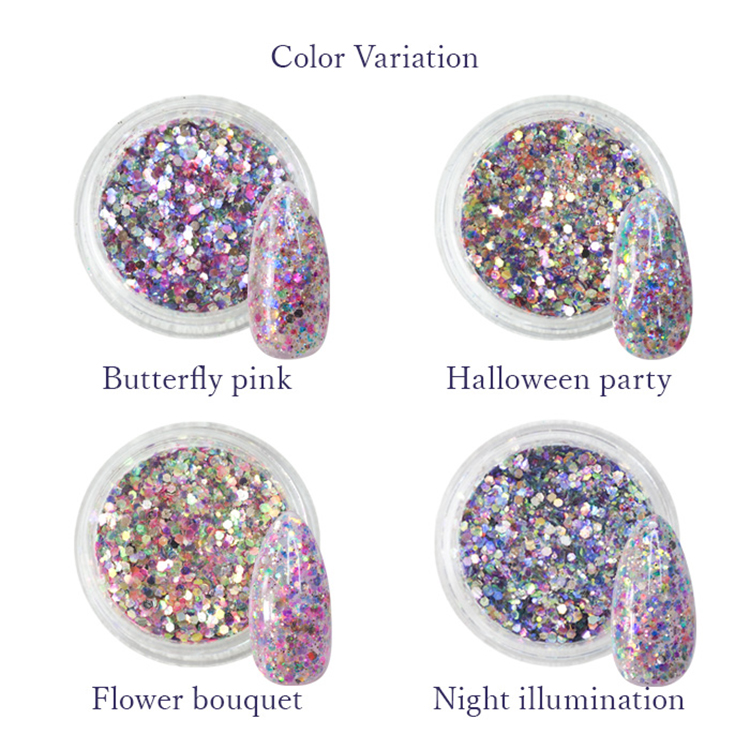 内容量:約0.9g色鮮やかで華やかな輝きを解き放つParty ShineGlitter! どのカラーも単色ではなく全く違うカラーをミックスしているので、 1カラーやグラデーションだけでも華やかでおしゃれなネイルデザインが楽しめます! またレジンと組み合わせることで、アクセサリーパーツ作りにも大活躍 。
