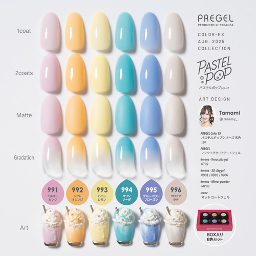 PREGELカラーEXから「パステルポップシリーズ」6色をリリース。 鮮やかなパステルトーンが、指先に軽やかな彩りを添える、爽やかな印象のカラーラインナップです。 1度塗りでも発色の良いカラーで、ワンカラーやグラデーションにもおすすめ♪ 6色セットの販売もございます。 カラーの種類:マットカラー UV/LED両対応(LED30秒、UV1〜2分)