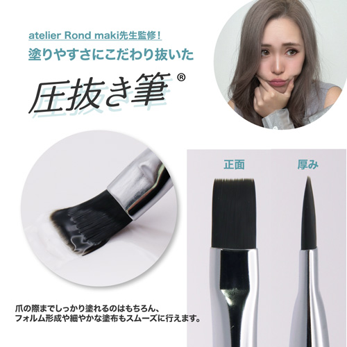 ピタベースのテクスチャーと抜群の相性の圧抜き筆。こだわりのサイズ感と毛量により、爪のキワまでスムーズにアプローチが可能。フォルム形成も思い通りに仕上がります。