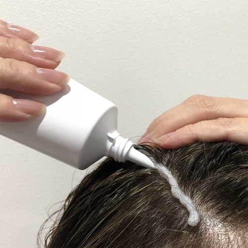 1. お湯でしっかりと濡らした髪の毛の水気を軽くきり、本品ノズルを直接頭皮にあて、筋をつけるように塗布。