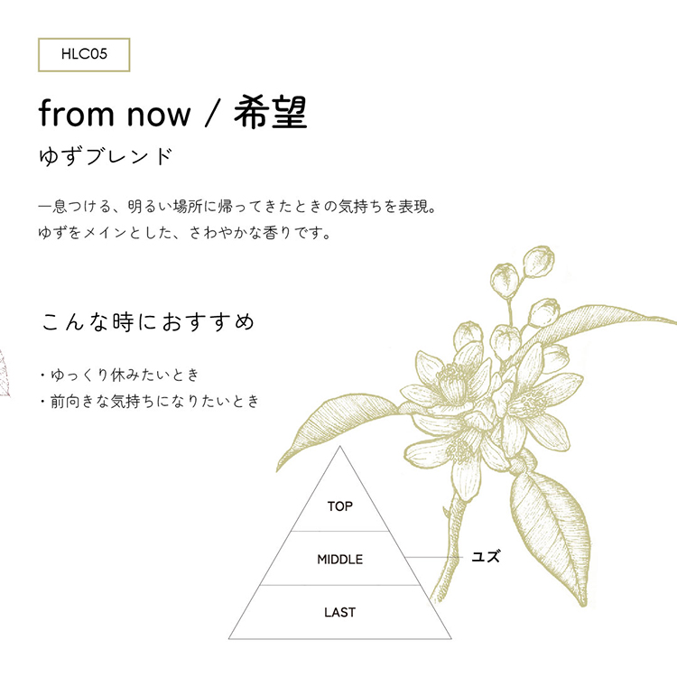 「from now/希望」は、一息つける、明るい場所に帰ってきたときの気持ちを表現。ゆずをメインとした、さわやかな香りです。