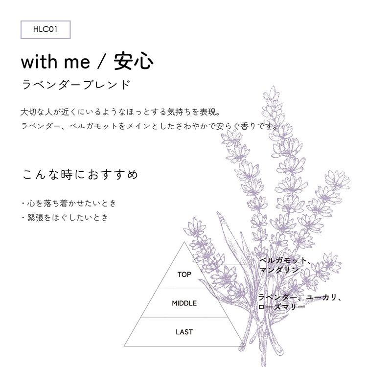 「with me/安心」は、大切な人が近くにいるようなほっとする気持ちを表現。ラベンダー、ベルガモットをメインとしたさわやかで安らぐ香りです。