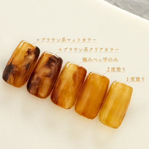べっ甲ネイルに最適な、ちゅるんと奥行き感、美しいクリア感、塗りやすいテクスチャーを実現。