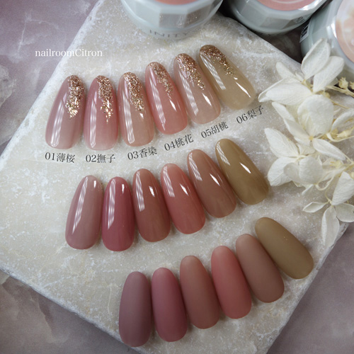 3gINITYからcitron nail 田村寛美先生プロデュースカラーが登場! 濡れたような艶めきを爪先に。 肌を美しく魅せるこだわりぬいた6色。 温もりを感じるヌードブラウン。 硬化時間 UV/LED30秒 UV60秒 ※硬化対応ライト:UVとUV/LED。*LEDのみは不可。