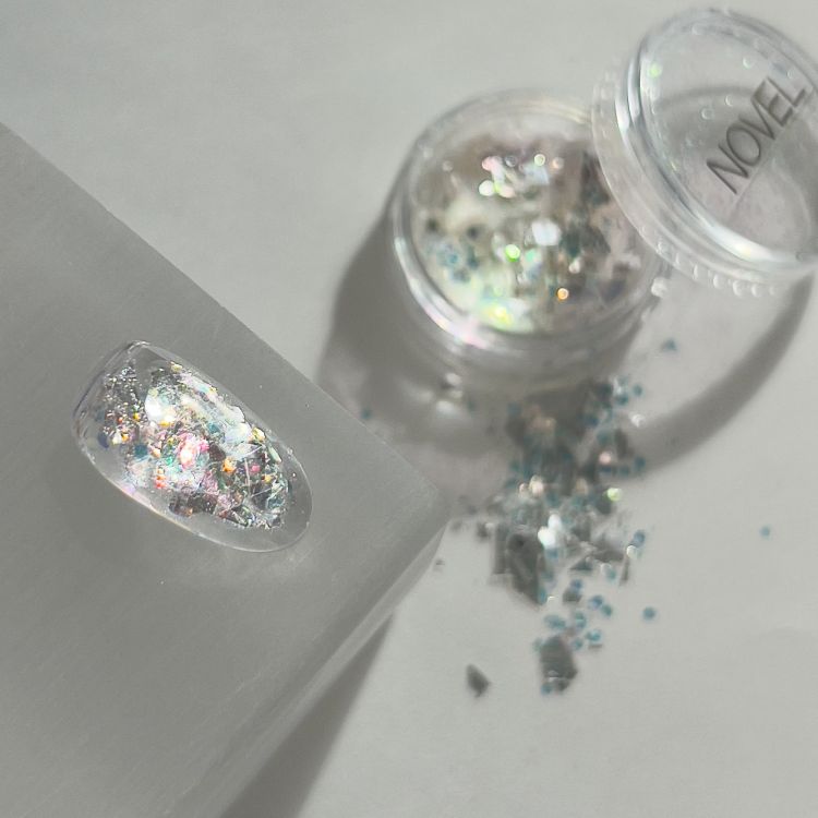 オーロラフレーク・オーロララメ・クリスタルフレーク・クリスタル乱切りホロを贅沢にミックスしたアイテムです。 さまざまな素材が重なり合うことで、まるで宝石を閉じ込めたような複雑で奥行きのある輝きを放ちます。 厚みが気になる場合は、トップジェルを2度塗り、またはイクステンショントップでコーティングしていただくと、 表面が美しく整い、さらに光の屈折が増して一段と輝きが際立ちます。 画像のように中央に寄せるように配置すると、再現性の高いアートを簡単に作ることができます。